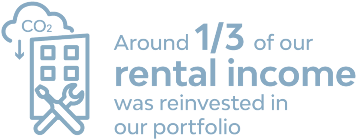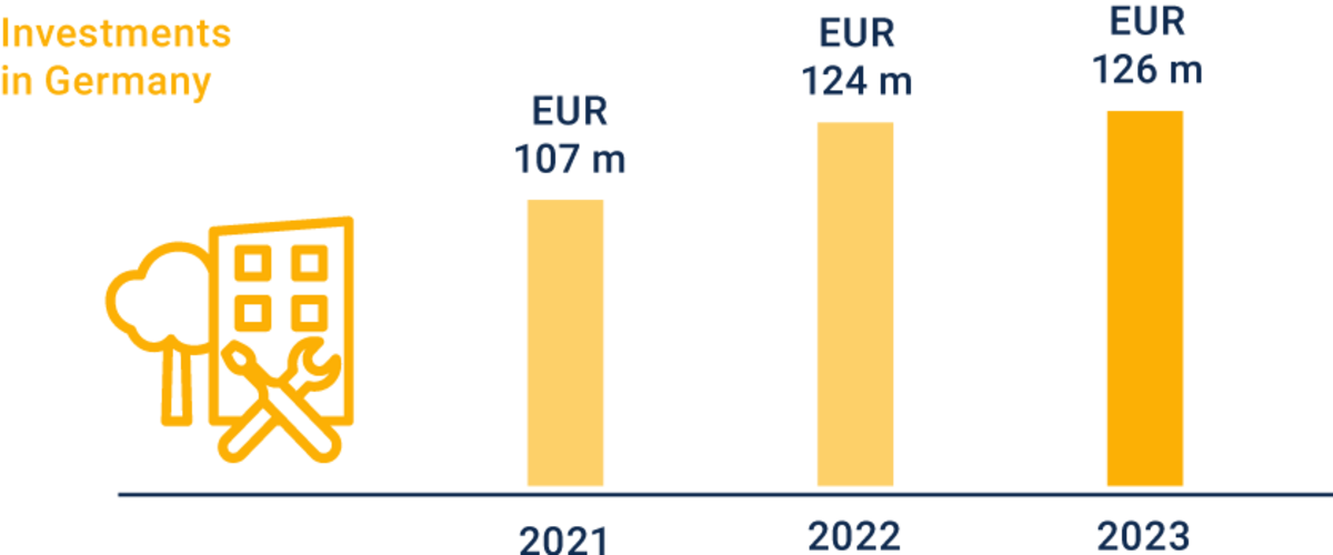 We take our ecological responsibility very seriously. This is why TAG is already implementing its own goals in various business areas. We invest continuously in the maintenance and modernisation of our portfolio. The focus here is on energy and emission-reducing measures in and on buildings, building technology and heating systems. In 2023, TAG invested approx. EUR 126 million in its portfolio in Germany alone, including maintenance expenses. These investments comprise around 1/3 of our rental income.