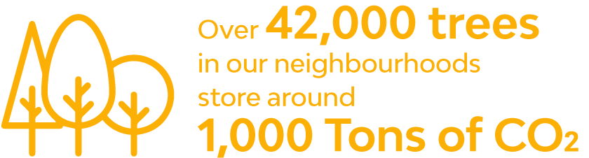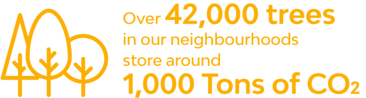 More than 42,000 trees grow on our properties, which not only positively influence the quality of stay in the neighbourhood, but also store around 1,000 tonnes of CO2 annually. The amount of CO2 saved in this way corresponds to approx: